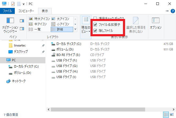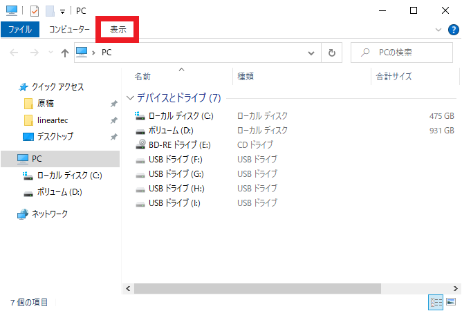 [Windows] キーを押しながら [e] キーを押して,エクスプローラを表示します.図8に示すようにウィンドウの上部に「表示」というタブがあるので,これを選択します.