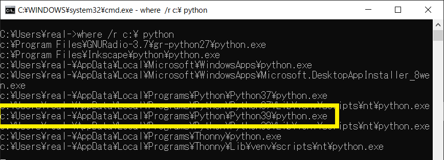 | リスト9 “python.exe”の場所(パス)を探すコマンド |