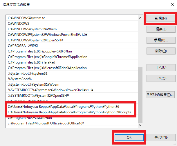 さらに,もう一度 [新規] をクリックして先ほどコピーしたパスを貼り付け,その末尾に“\Scripts”を書き足します(“C:\... \Python\Python3x\Scripts”といった形になる).これでpipを実行できるようになります.