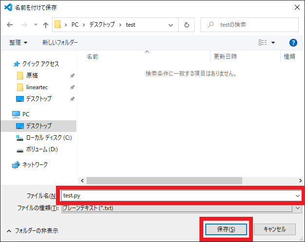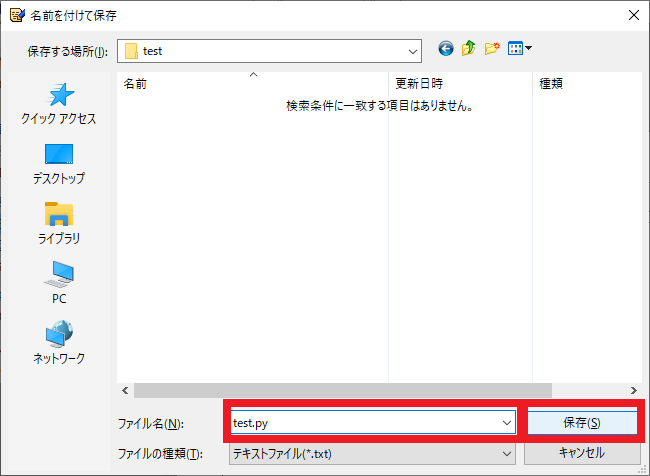 図105の画面でファイル名と保存先を指定します.今回はデスクトップに“test”というディレクトリを作り,“test.py”という名前で保存しました.