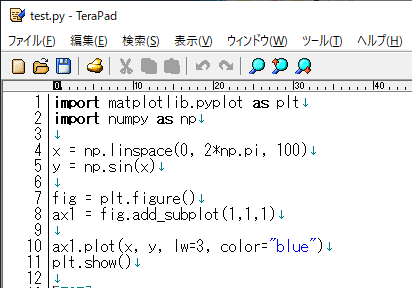 TeraPadからPythonインタプリタを呼んで,問題なくプログラムを実行できるか確認しておきます.