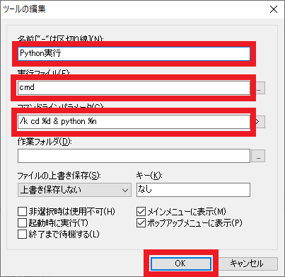 「ツールの編集」という画面が開くので,図100のように各項目を入力します.「名前」の欄は“Python実行”としましたが,これはお好みで決めてください.「実行ファイル」は“cmd”と入力します.これはコマンド・プロンプトを起動することを意味します.「コマンドライン パラメータ」の欄にはリスト7のコマンドを記入します.