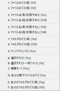 “%d”はTeraPadで開いているファイル(今回の場合はPythonソース・コード)が保存されている「ディレクトリのパス」を意味します.これはTeraPad用のコマンド(というより変数)です.「コマンドライン パラメータ」の入力欄の右側にある [$>$] マークをクリックすると,図101のようにTeraPadで使用できる変数の一覧が表示されます.