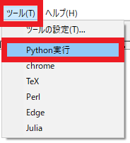 以上の設定をしてからメニュー・バーの [ツール] をクリックすると,図102のように「Python実行」のコマンドが表示されます(他のコマンドは筆者の環境で使っているものなので無視してください).