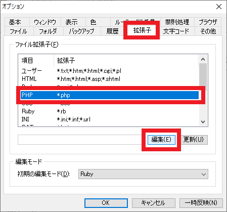 図92の画面が開くので「拡張子」タブを選択します.ここで“PHP”の項目を選択して [編集] をクリックします.