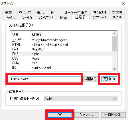 図93のように,入力欄に“*.php;*.py”と入力します(セミコロン”;”で区切って“*.py”を追記する).この状態で [更新] をクリックします.[OK] をクリックして,一度この画面を閉じます.