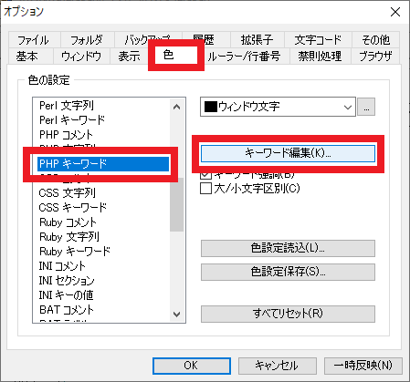 図95のように「色」のタブを開き,「PHPキーワード」の項目を選択した状態で [キーワード編集] をクリックします.