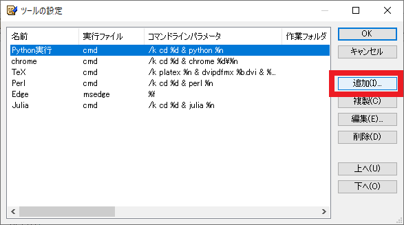 図99の画面が開くので,[追加] をクリックします(これは筆者の環境なので既にいくつかツールを登録してある).