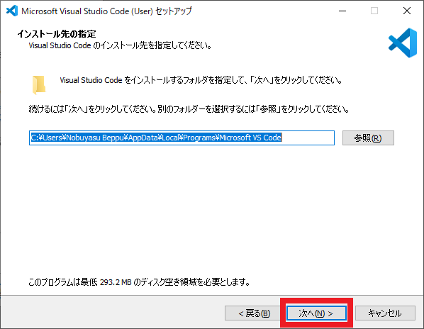 図18の画面では,インストール先のディレクトリを選択します.今回はデフォルトのままとしました.[Next] をクリックして次に進みます.