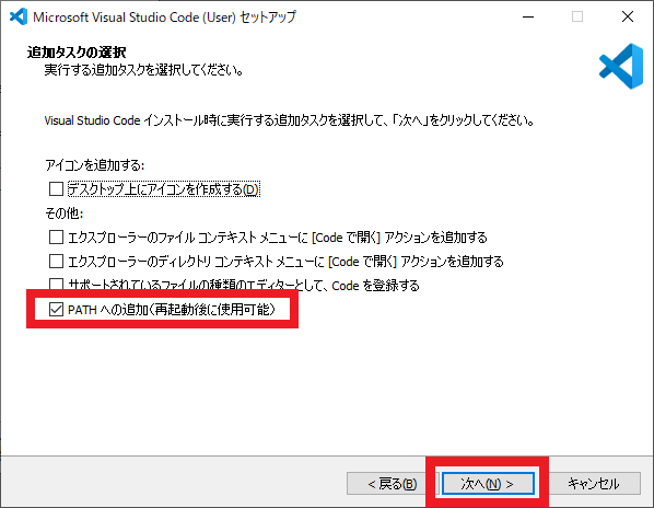 今回は(この記事を書くために)“Anaconda”,「VS Code + Python公式インタプリタ」,「TeraPad + Python公式インタプリタ」の3種類の開発環境を1つのパソコン上に構築するので,デフォルトのパスをAnacondaに固定されると困ります.よって,「すべてのチェックを外す」ようにしました(Anacondaだけを使う場合でもこの設定で問題なく動く).
