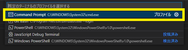 図73のように既定のターミナルの選択肢が表示されるので,“Command Prompt”(コマンド・プロンプト)をクリックします.