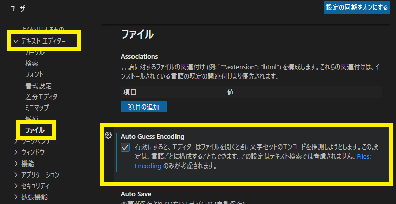 図70の画面が表示されるので,「テキスト エディター」の項目を展開して「ファイル」を選択し,“Auto Guess Encoding”にチェックを付けます.