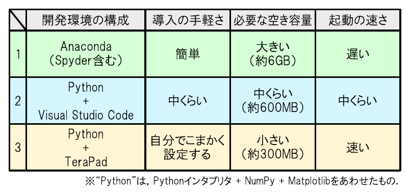 これから「Pythonインタプリタ本体」,「エディタ」,“NumPy”,“Matplotlib”をインストールしてプログラムの開発環境を整える方法を3種類紹介します.自分の好みや用途にあわせて好きなものを選択してください(3つすべての開発環境をインストールしても良い).以下,各構成の概要を簡単に説明します.