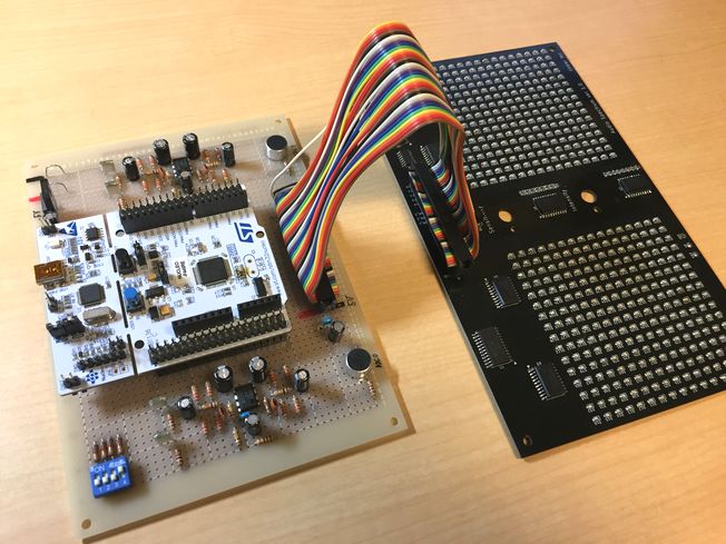このシステムはコンデンサ・マイクで拾った音声信号をアンプで増幅し,その信号をマイコンのAD変換器に入力しています.マイコンはこの音声データを対象として「高速フーリエ変換」と呼ばれる演算を実行します.この演算を行うと,入力された音声データに含まれる音の周波数分布(周波数スペクトル)を求めることができます.演算結果として得られた周波数スペクトルは,写真1(b)のLEDマトリクスに表示されます.マイクは右と左の2個あるので,周波数スペクトルもそれぞれに対応したものが表示されます.