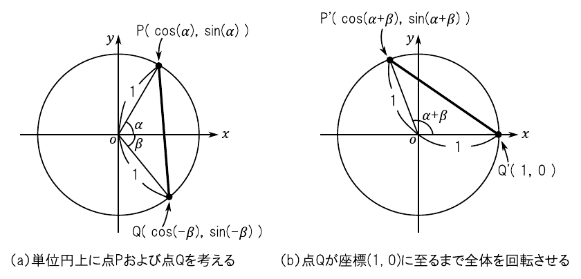 図11(a)のように,単位円上に点Pと点Qをとります.それぞれの点を$x$軸から見た角度を“$\alpha$”および“$\beta$”とします.このとき,弦PQの長さの2乗は「三平方の定理」より次のように求められます.