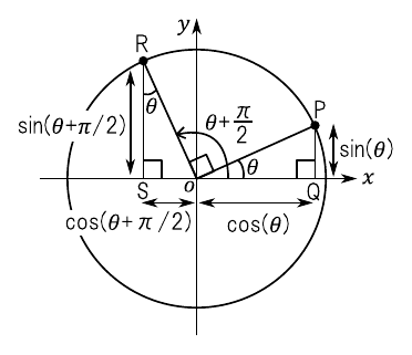 図12のように,単位円上に点Pと点Rをとります.$\mathrm{\Delta OPQ}$と $\mathrm{\Delta ROS}$は合同なので,$\sin$および$\cos$の定義から次の2式が得られます.