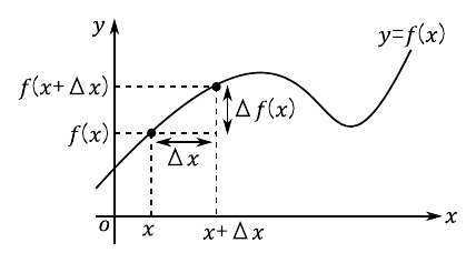 \begin{equation} \mathrm{「傾き」} = \cfrac{\Delta f(x)}{\Delta x} = \cfrac{f(x+\Delta x) - f(x)}{\Delta x} \end{equation}ここで幅“$\Delta x$”を限りなく0に近づけると,本当の意味で「位置$x$における(ピンポイントの)傾き」を表現できると考えられます.すなわち,次のような極限を考えます.