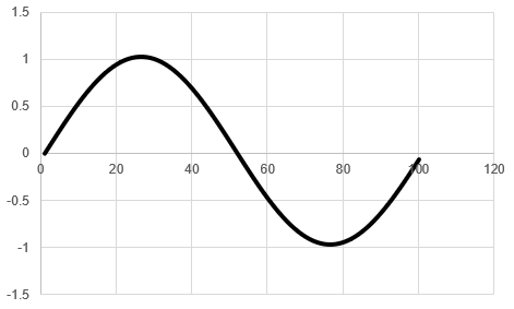 Excelを起動し,一番左上のセル(A1セル)を選択した状態でキーボードから[Ctrl] + [v]を入力します.先ほどコピーしたデータが貼り付けられたことを確認したら,続いてA列全体を選択します(図8.この状態で画面上部のメニュー・バーの[挿入]タブを選択し,「散布図(平滑線)」をクリックします(図9.図10のように1周期分の$\sin(\theta)$のグラフが表示されれば成功です. これ以降,グラフを描く時はこれと同様の手順で行うものとします.