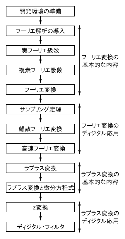図2に,本連載の流れを示します.はじめにマイコンの開発環境を整えてから,本題であるフーリエ解析の理論に入っていきます.