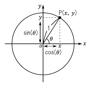 図4のように半径が“1”の円を考えます.このような円を「単位円」(unit circle)といいます.単位円の円周上にある点“$\mathrm{P}(x,y)$”を考え,$x$軸から点Pを見た角度を“$\theta$”とします.この点Pの$x$座標を“$\cos (\theta)$”,$y$座標を“$\sin (\theta)$”と定義します.