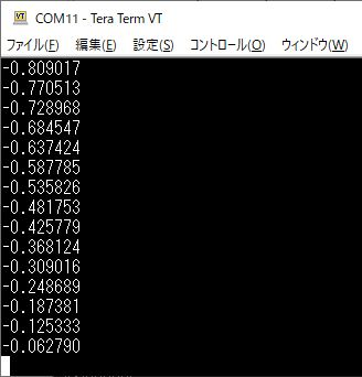 “sin_array[]”という配列を用意して,$\sin(\theta)$の値を1周期分格納しています.今回は1周期($2\pi = 2 * \mathrm{M\_PI}$)を100分割した値を“delta”という変数に格納し,この値を刻み幅として$\sin(\theta)$のデータを作っています.作成したsin_array[]のデータは,printf()関数を使ってUARTから出力しています.