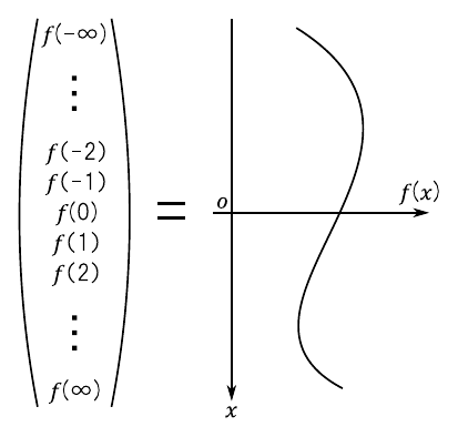 \begin{equation} \label{eq:fourier_series} f(x) = \cfrac{a_0}{2} + \sum^{\infty}_{k=1}a_k \cdot \cos(kx) + \sum^{\infty}_{k=1}b_k \cdot \sin(kx) \end{equation}フーリエ級数の意味を考える上で重要となるのが,図1のように「関数を1つのベクトルと見なす」というアプローチです.図2に示すように関数“$f(x)$”は「無限次元空間にある1本のベクトル」であり,“$\sin$”や“$\cos$”はこの無限次元空間における「基底ベクトル」に相当すると考えられます.このイメージにしたがうと,一般的なベクトルを表現する場合と同様に「各基底を適当な大きさずつ足しあわせる」ことで様々な関数“$f(x)$”を表現できると考えられます.式1のフーリエ級数は,このような考えにもとづいて作られた式でした.