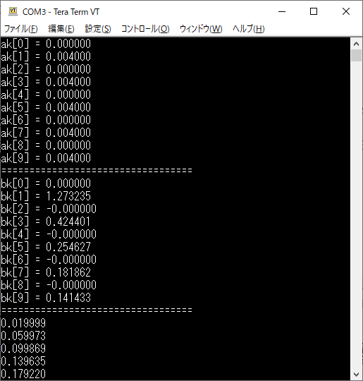 24行目から28行目では,“calc_ak()”関数を使ってフーリエ係数“$a_0$”および“$a_k$”を求めています.デバッグのために,各周期の係数“$a_k$”が求まるたびに“printf()”関数で表示するようにしています.