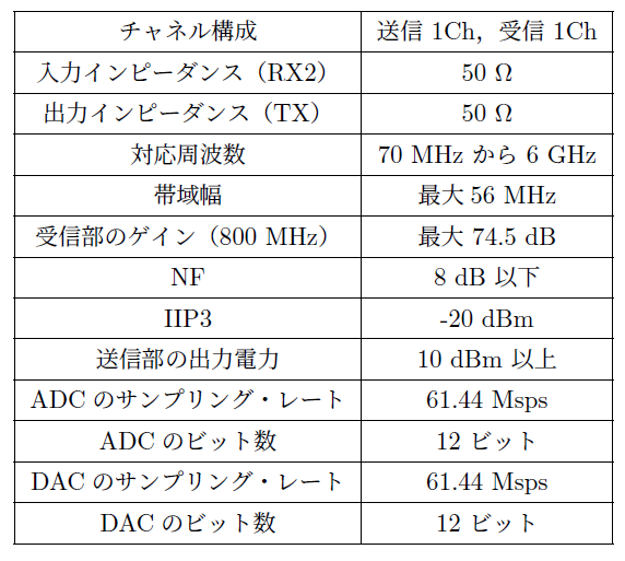 今回の実験で使う“USRP B205mini-i”の主な仕様を表1に示します.対応周波数は70 MHzから6 GHz,帯域幅は56 MHzということで,SDRのちょっとした実験をするには十分な性能を持っています.