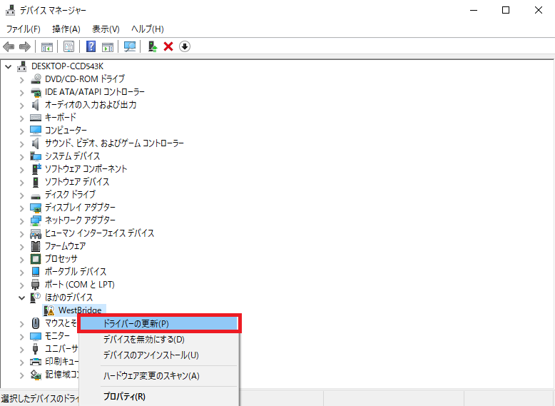 “USRP B205mini-i”のドライバがインストールされていない状態では,図15のように「ほかのデバイス」の欄に“WestBridge”という項目があります.これを右クリックして[ドライバーの更新]をクリックします.