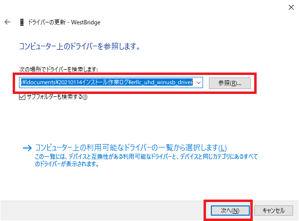 図17の画面が表示されるので,[参照]ボタンをクリックして先ほどダウンロードして展開しておいた“erllc_uhd_winusb_driver”のディレクトリを選択して[次へ]をクリックします.