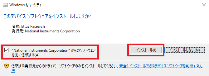 パソコン側がドライバを見つけると図18の画面が表示されるので,「“National Instruments Corporation”からのソフトウェアを常に信頼する」にチェックを付けて[インストール]をクリックします.