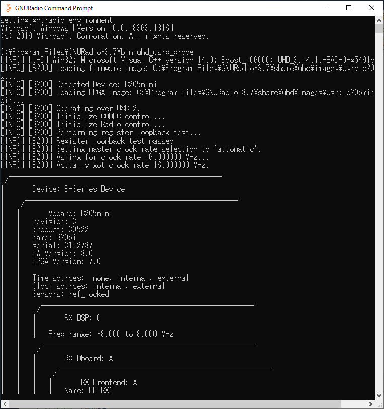 もし“Error: LookupError: KeyError: No devices found for -----$>$ Empty Device Address”などのエラー・メッセージが表示される場合は,ここまでのインストールの手順が正しく行われていることを確認してください.また,一度“USRP B205mini-i”をパソコンから抜いてから再び接続する,接続するUSBポートを変えてみる,パソコンを再起動するなどしてみてください.