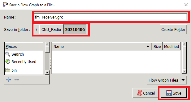 まだ何もしていませんが,先にファイルを保存しておきましょう.[File] - [Save as]をクリック(あるいは[Ctrl] + [s]を押す)して,図25のようなファイル保存のダイアログを出します.今回は“fm_receiver.grc”というファイル名にしました.繰り返しになりますが,保存先のパスには日本語が含まれないように注意してください.