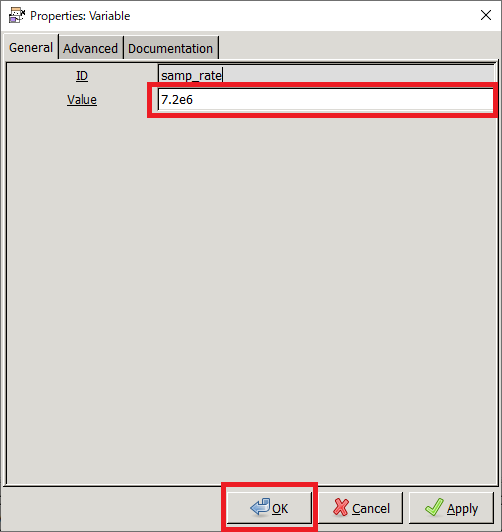 この“Variable”のブロックをダブル・クリックすると,図27の画面が出ます.ここで“Value”の欄に“7.2e6”(1e6 = 1,000,000)と入力して[OK]をクリックします.これで,今後“samp_rate”と記述した箇所には“7.2M”(7,200,000)という値が代入されます.