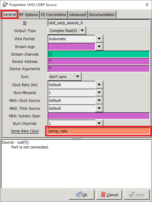 追加した“UHD: USRP Source”のブロックをダブル・クリックすると,図33の画面が表示されます.まずは“General”のタブを選択し,“Samp Rate”の欄に“samp_rate”と入力します.これで変数“samp_rate”の値がUSRPのサンプリング・レートとして設定されます.