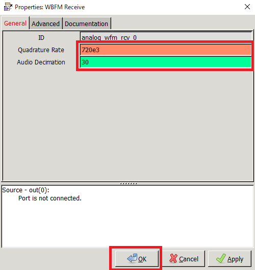 “WBFM Receiver”ブロックをダブル・クリックして,図44の画面を出します.“Quadrature Rate”の欄に“720e3”と入力し,“Audio Decimation”の欄に“30”と入力して[OK]をクリックします.