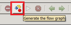 GNU Radioの画面上部の“Generate the flow graph”ボタン(図53)をクリックします.このボタンをクリックすると保存先のディレクトリに“top_block.py”というPythonファイルが作成されます.もしこのボタンを押せない場合は,どこかのブロックの設定を間違えている可能性があります.ブロックの文字が赤色になっている箇所を探して,設定内容を修正してください.