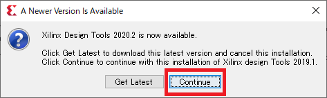 続いて最新のバージョンがあることを通知するウィンドウが出ますが,今回インストールするバージョンは“2019.1”で良いので[Continue]をクリックします(図10).