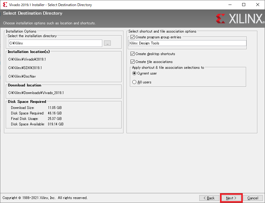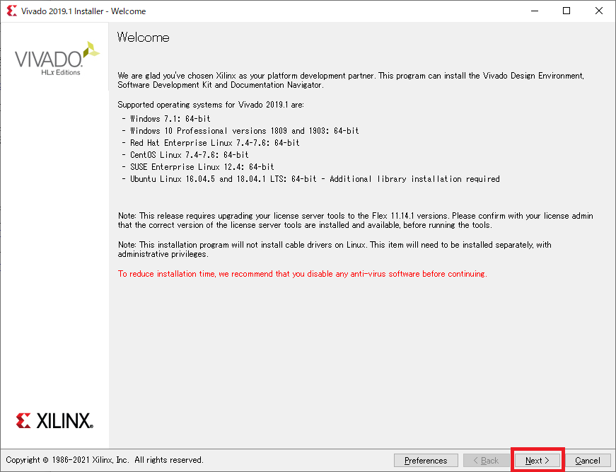 図11の画面ではVivadoをインストールする環境について注釈が出るので,[Next]をクリックします.