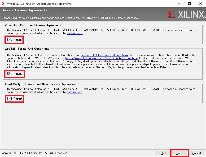 図13の画面ではライセンス関係の同意を求められるので,3箇所にチェックをつけて[Next]をクリックします.