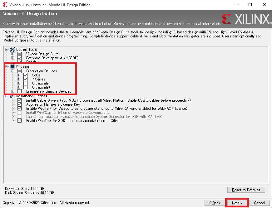図15の画面では,実際に開発対象とするデバイスを選択します.今回はディスク容量を節約するために,“Devices”の項目の“SoCs”と“7 Series”だけにチェックを付けて,“UltraScale”および“UltraScale+”といった回路規模が大きいデバイスは除外しておきます.それ以外はデフォルトのままにします.