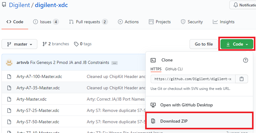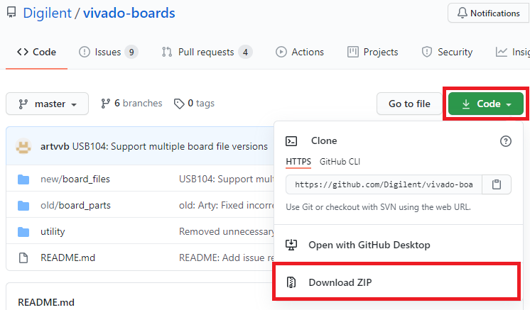 まず,Digilent社製のボードのハードウェア情報が保管されているGitHubのWebページにアクセスします.図20のように“Code”ボタンをクリックして“Download ZIP”をクリックします.