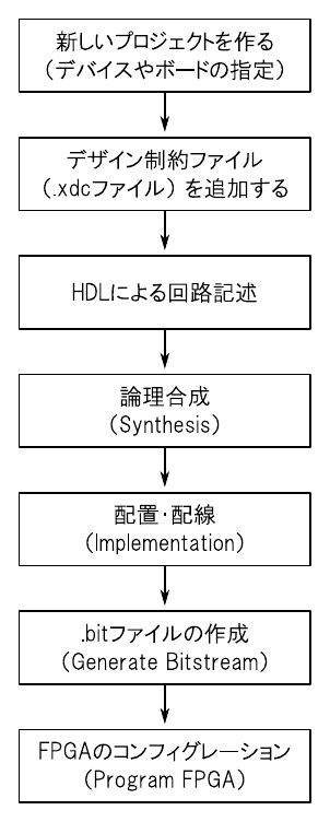 これから行う操作の流れを図23に示します.最初に新しいプロジェクトを作成して,使用するデバイスやボードを選択します.続いて,Zynqの各ピンの割り当てを記述した「デザイン制約ファイル」(“Xilinx Design Constraint”ファイル)を追加します.その後PLの内部に作り込む回路をハードウェア記述言語(HDL)で記述します.今回はHDLとして“Verilog HDL”(以下Verilog)を使います.Verilogによる回路の記述が済んだら「論理合成」,「配置・配線」,「ビットストリーム・ファイル(.bit ファイル)の作成」を行ってZynqに書き込むファイルを作ります.最後にZynqに対してビットストリーム・ファイルを書き込んでコンフィグレーションすれば完了です.