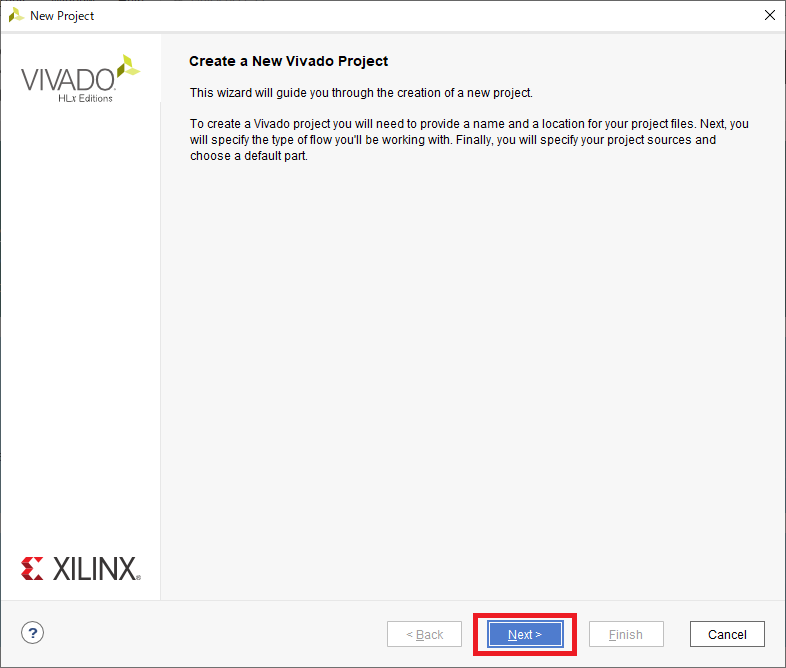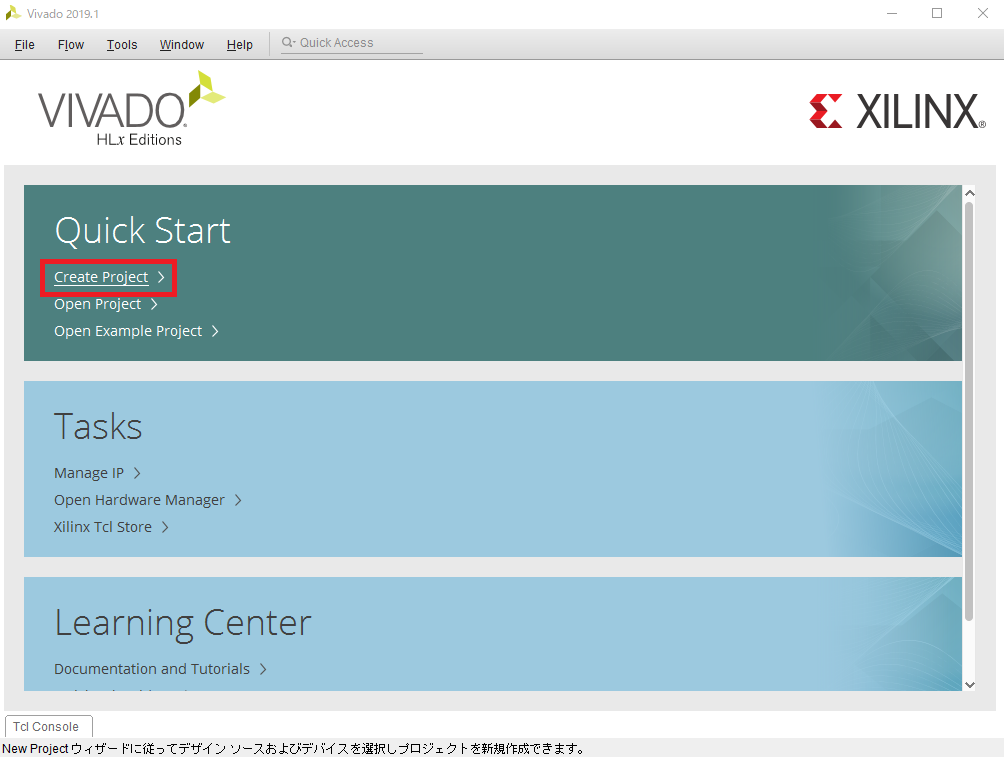 Windowsスタート・メニューから[X] - [Xilinx Design Tools] - [Vivado 2019.1]をクリックしてVivadoを起動します.Vivadoが起動すると図24の画面が表示されるので,[Create Project]をクリックします.続いて表示される図25の画面では[Next]をクリックします.