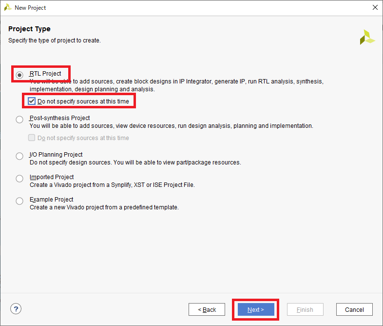 図27の画面ではプロジェクトの種類を指定します.今回は“RTL Project”を選択します.また,今回は既存のファイルがまったく無い状態からプロジェクトを作成するので“Do not specify sources at this time”にチェックを付けておきます.
