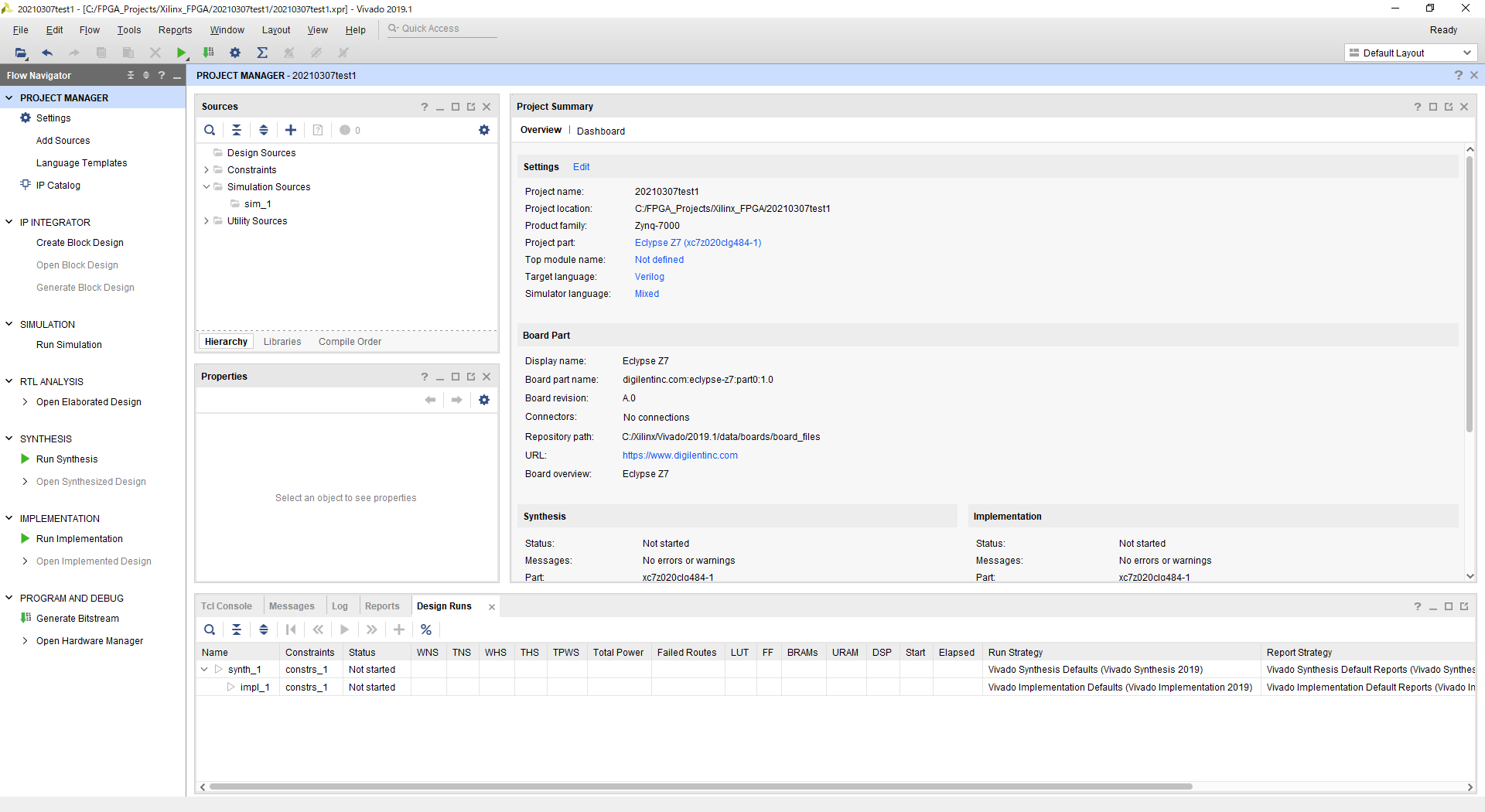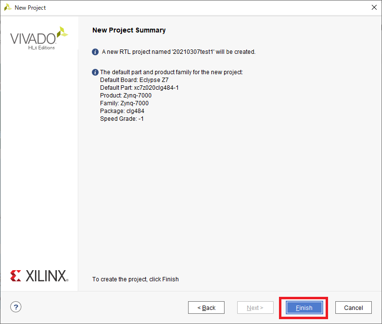 図26の画面ではプロジェクトの名前と保存先を指定します.今回は“20210307test1”というプロジェクト名にしました.プロジェクトを保存するディレクトリは,適宜決めてください.私は今後の実験をまとめて管理するために“C:/FPGA_Projects/Xilinx_FPGA”というディレクトリを作成して,この中に各プロジェクトを保存するようにしています.