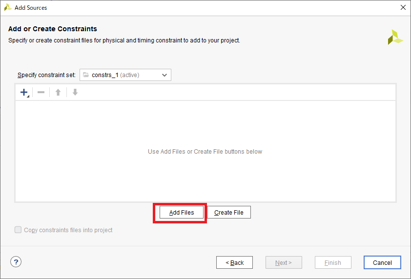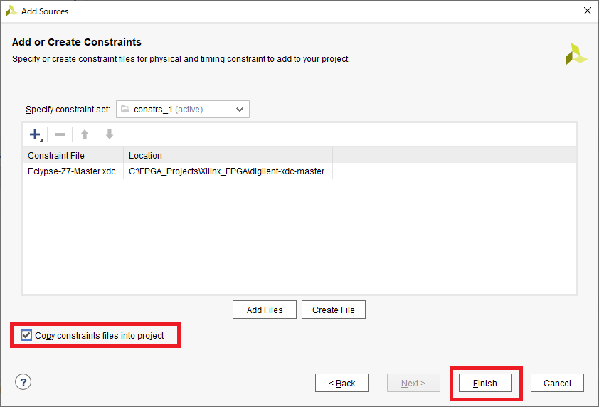 図36の画面に戻るので,“Copy constraints file into project”にチェックを付けて[Finish]をクリックします.このオプションにチェックを付けておくと,元の.xdcファイルをコピーしたものがプロジェクトのディレクトリ内に保存されるます.オリジナルの.xdcファイルが変更されることを防げるので,チェックを付けておくことをお勧めします.