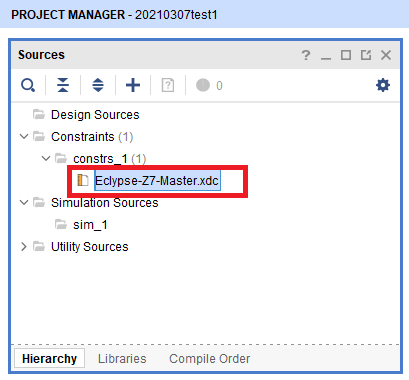 .xdcファイルを追加できたら,図37のようにVivadoの“Source”エリアにある“Constraints”を展開して“Eclypse-Z7-Master.xdc”があることを確認します.これをダブルクリックすると,.xdcファイルの編集画面が開きます.