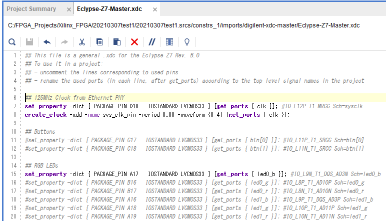 図38の編集画面で,.xdcファイルを次のように編集します.まず,125 MHzのクロック信号が入力されるピンをアクティブにするために,7行目と8行目をコメント・アウトしている“#”を削除します.さらに,LEDに接続されているピンもアクティブにします.今回は15行目の文頭の“#”を削除して“led0_b”を有効にしました.これで“LED0”(基板上のシルクは“LD0”)の青色LEDに接続されているZynqのピンが有効になります.