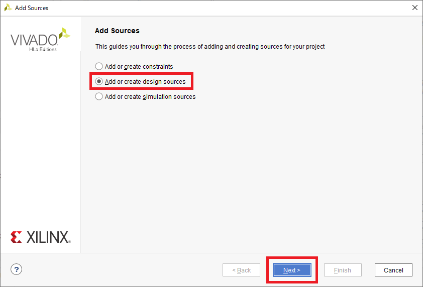 FPGA(PL)に作り込む論理回路を設計します.図39のように“Add Sources”をクリックします.続いて表示される図40の画面では“Add or create design sources”を選択して[Next]をクリックします.